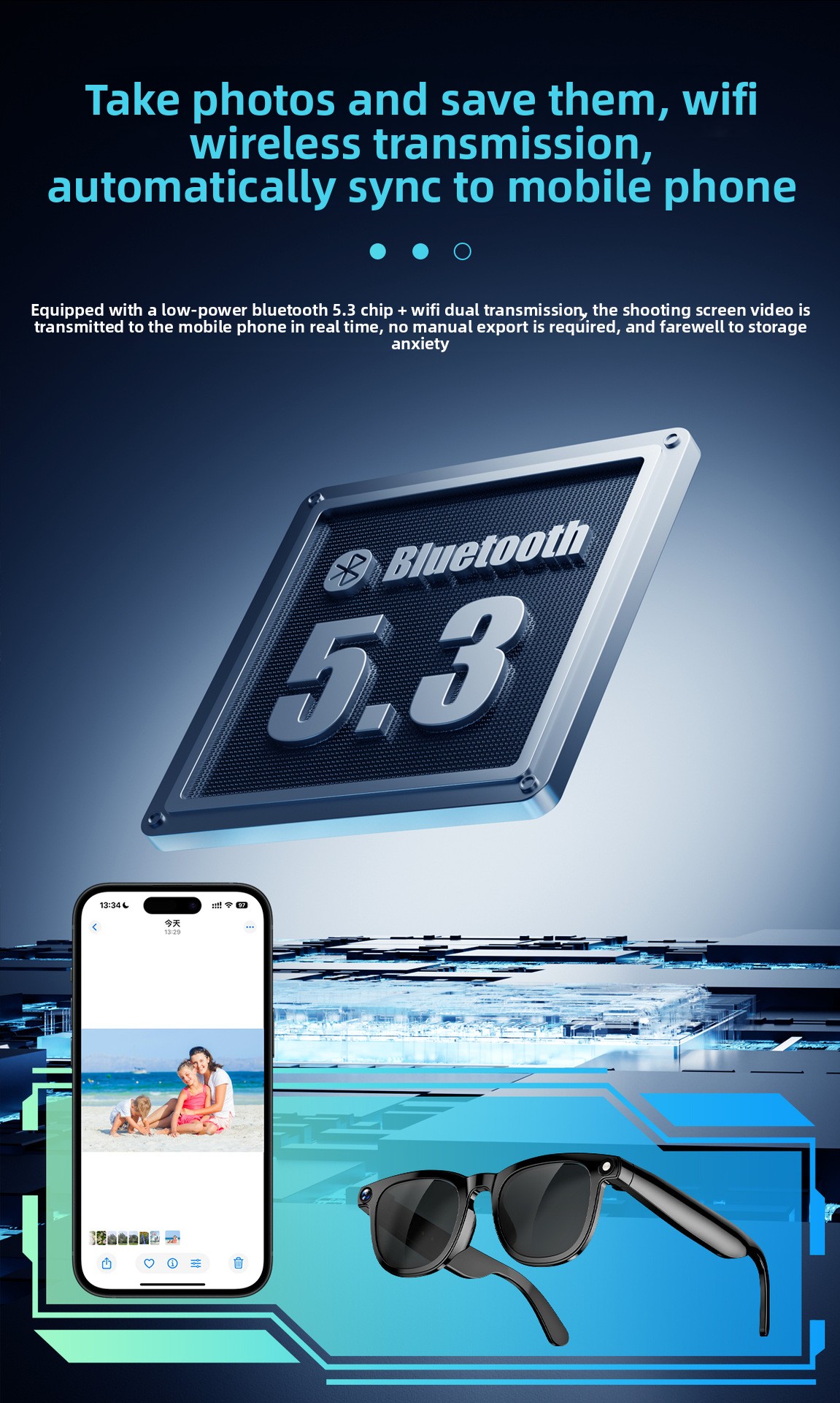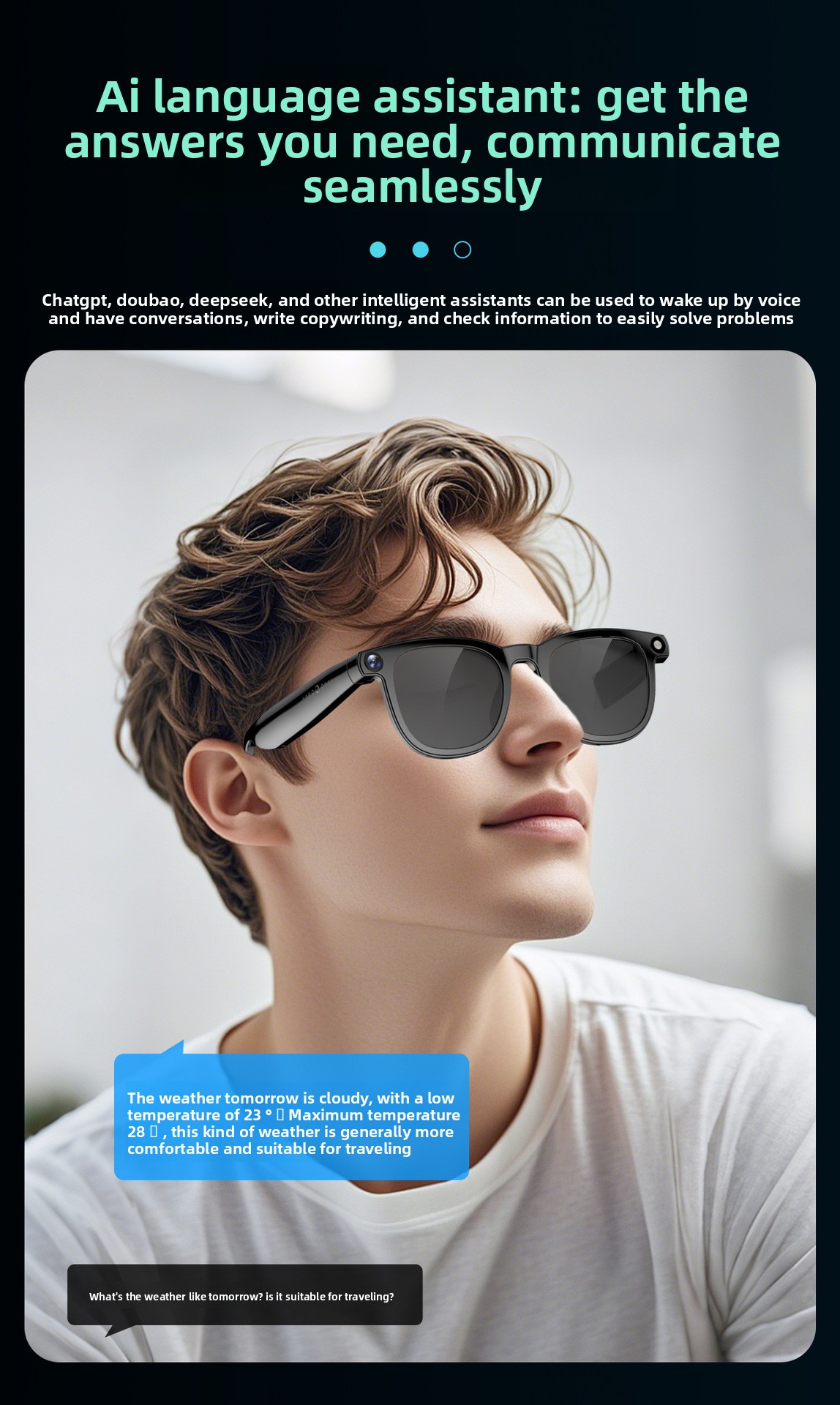 AI-Powered Smart Glasses: Advanced AI capabilities including photo, video, voice wake-up, music control, and call functions.